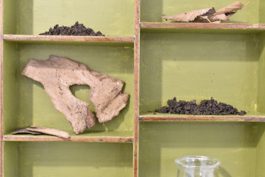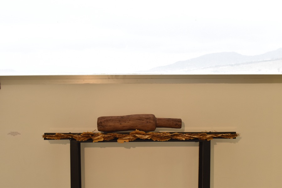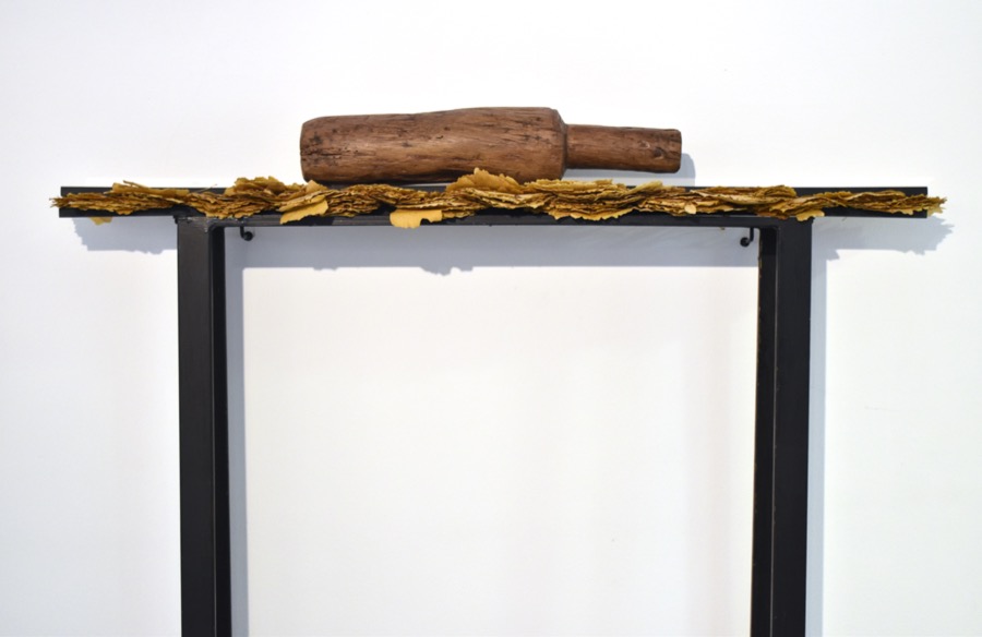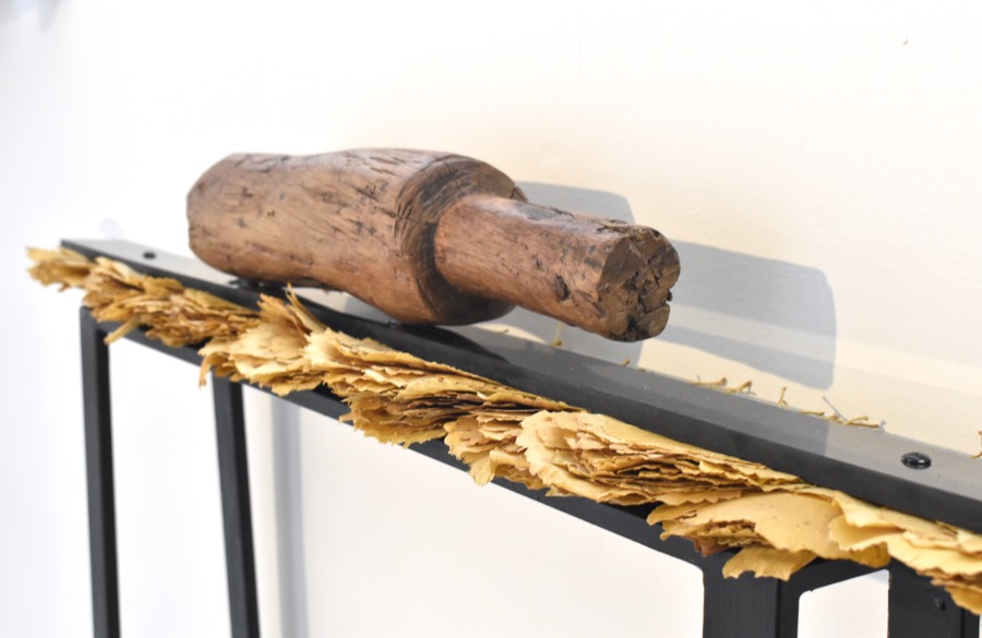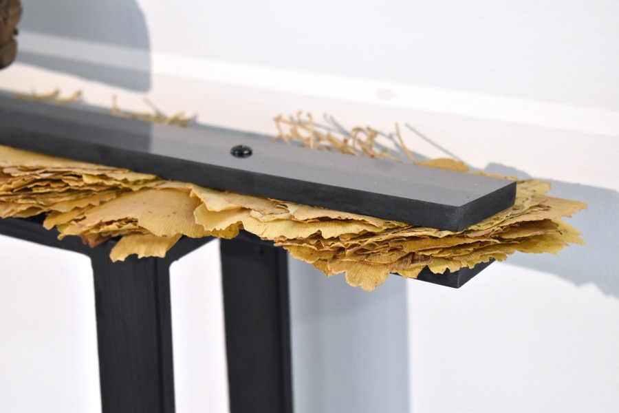 Instalación de objeto de madera, hierro, hojas de ginko recolectadas y metacrilato