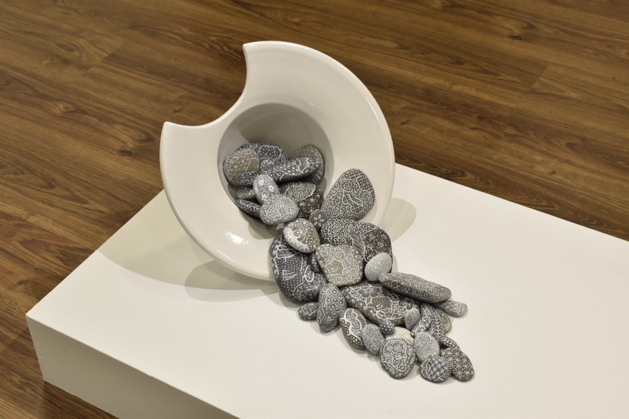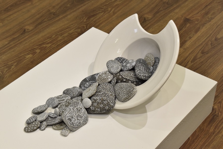 Escultura objetual (piedras decoradas con rotulador introducidas en una bacía de cerámica esmaltada)
