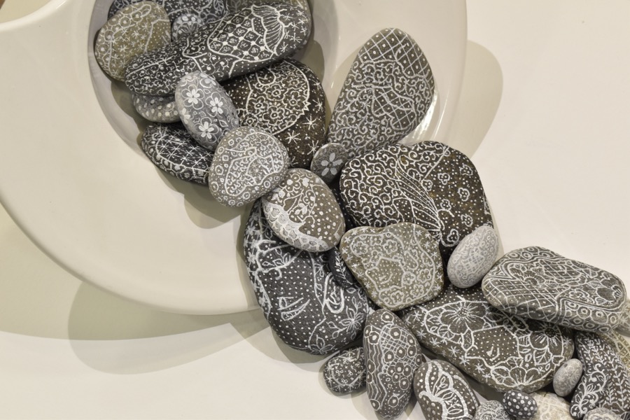 Propuesta realizada dentro de un trabajo de investigación sobre el auge de las barbas en las primeras décadas del siglo XXI, desarrollada in situ durante dos veranos en la playa de la Joya (Granada). En ella se relaciona su vinculación a la virilidad y la hombría (al ser asociadas con la autoridad, contundencia, dureza, poder, etc.) con las piedras y cantos rodados de la playa, y se confronta con la fragilidad y sutileza de dibujos blancos de motivos florales y filigranas decorativas asociadas a lo femenino. Depositadas, finalmente, dentro de una bacía de cerámica a modo de barbas afeitadas.